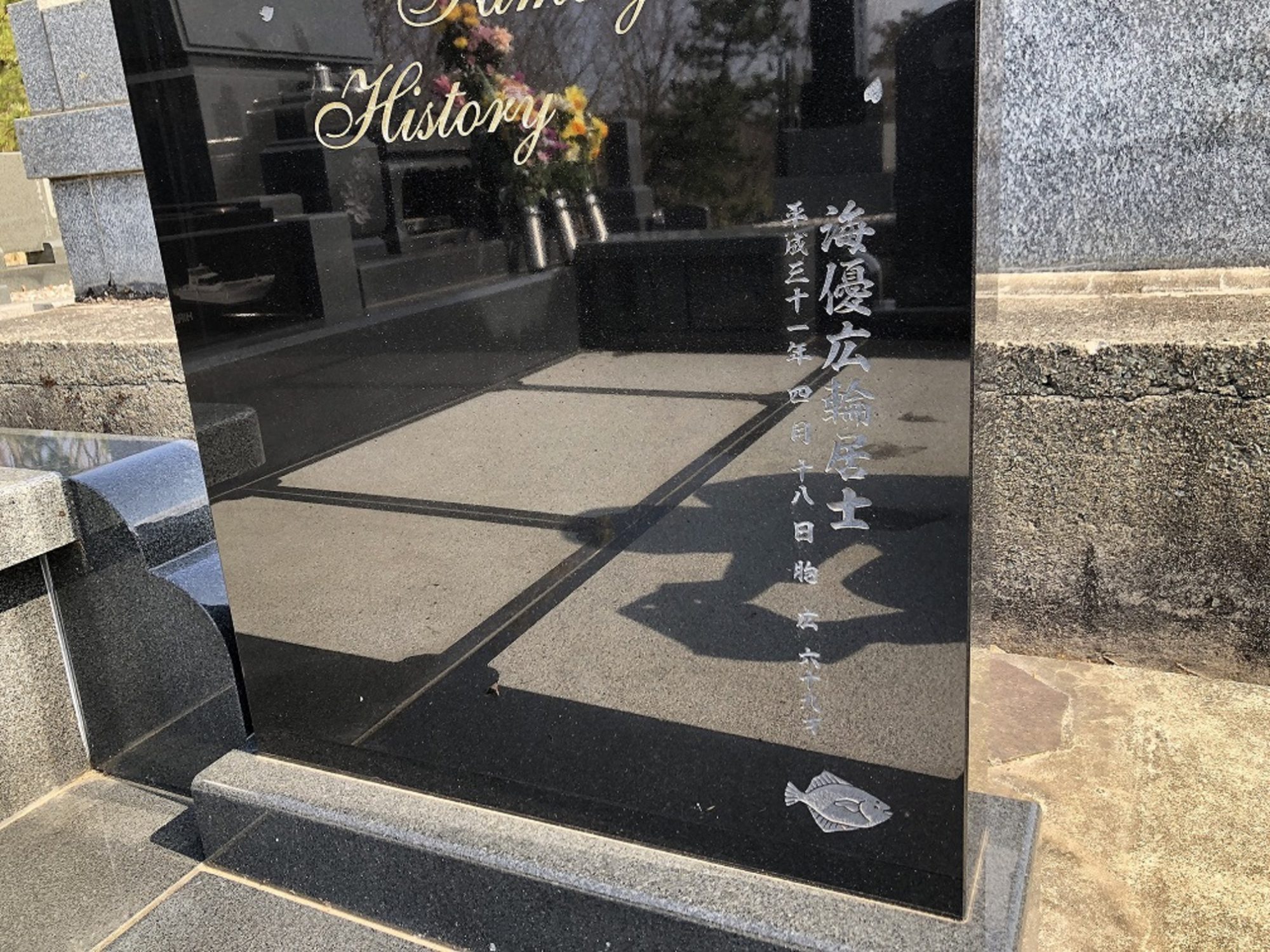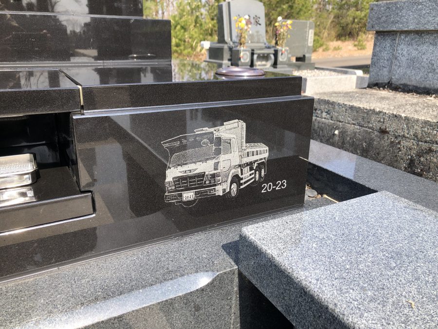 実物のダンプはご納骨の日にご長男が「親父に見せる」と乗ってきたものです。私もご納骨にダンプが来るのを見たのは初めてでした。お墓を検討する際に「なにかお父さんの思い出を」とご提案して出て来た候補は、どれかを選べずにすべて採用することになりました。奥様、お子さん、お子さんのお嫁さん、お孫さん、みんなが大好きなお父さんのお墓です。